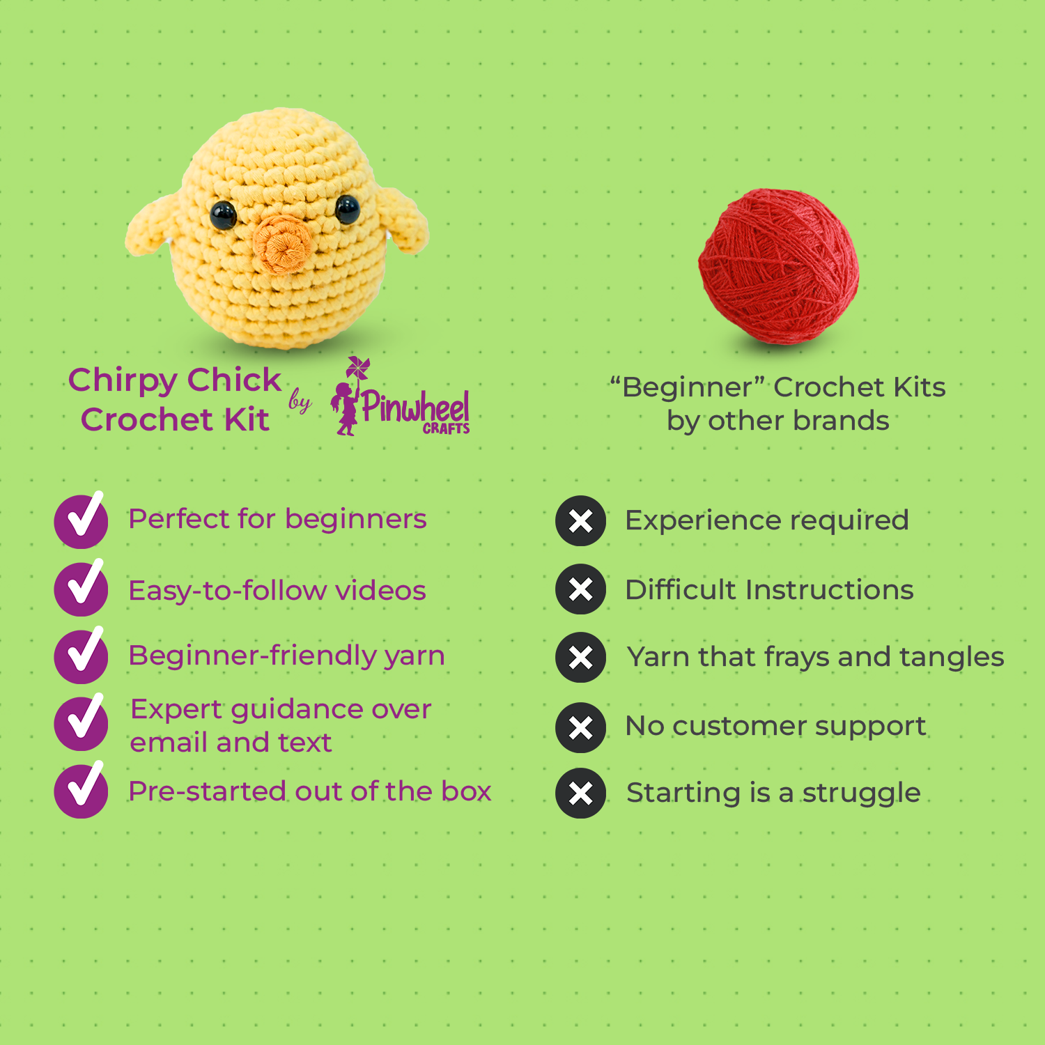 Get ready for a chirp-tastic adventure with Pinwheel Crafts' Chirpy Chick Crochet Kit! This delightful DIY beginner crochet kit contains everything budding artisans need to create their very own adorable and cuddly crochet chick — perfect for play time or display.