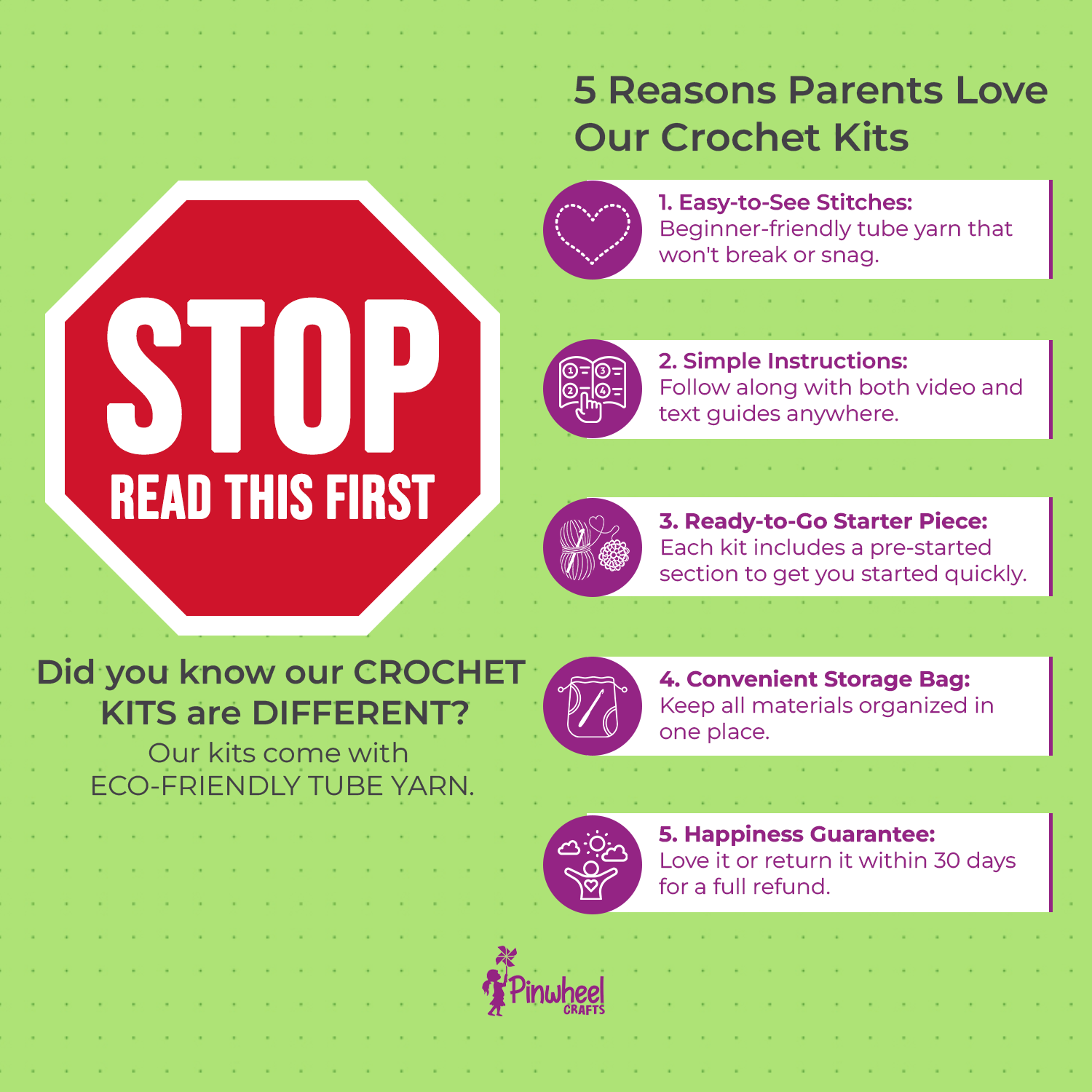 If you are not 100% satisfied with any product you buy from us, let us know within 30 days of purchase by contacting us at support@pinwheelcrafts.com. We’ll confirm your order, then provide you instructions to return your product to us, new, used, or broken. Once we receive it, we’ll give you a 100% refund. It’s that simple!