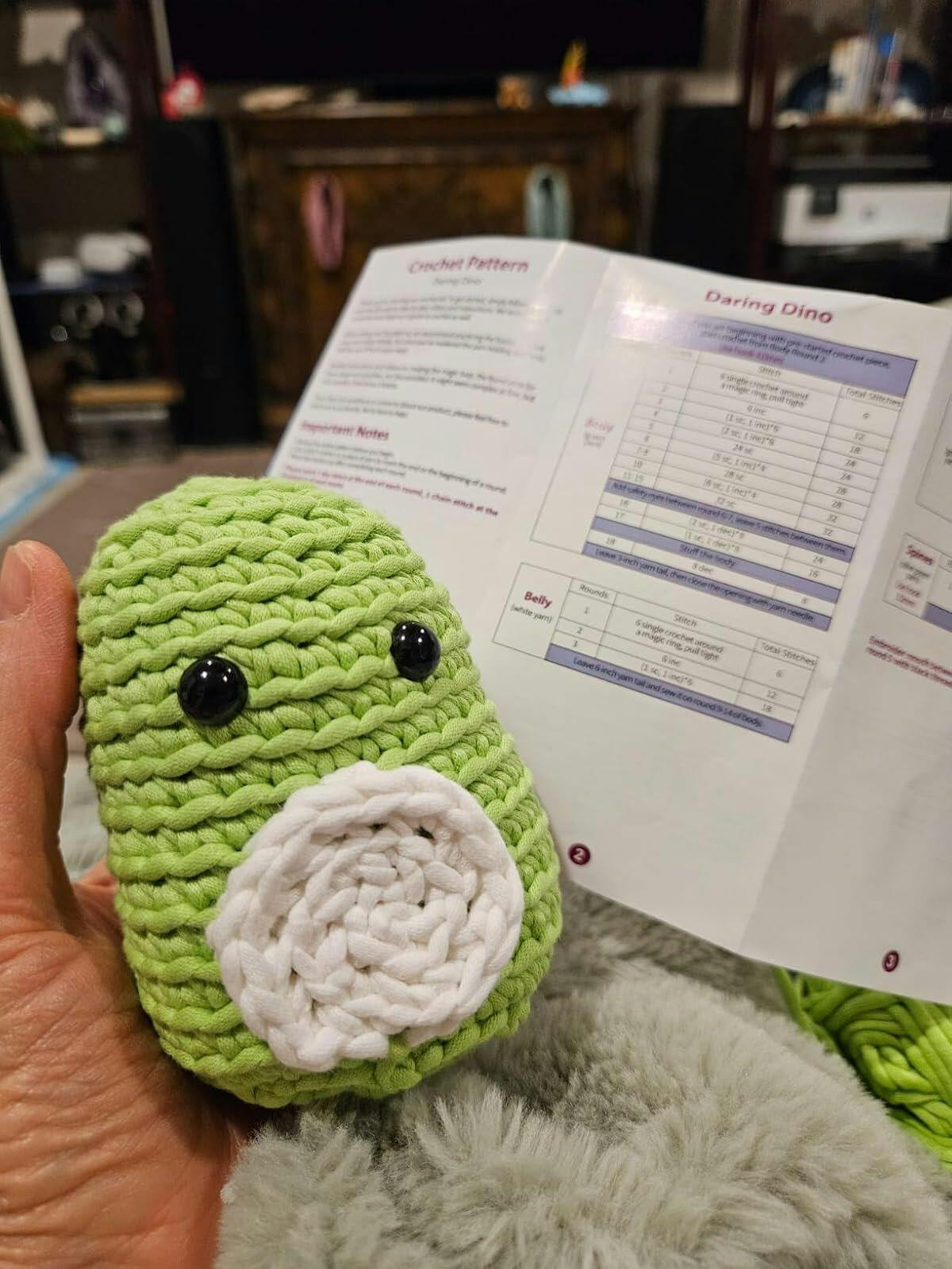 This is a project for anyone! It comes with directions, both written out in patterns and online. The online directions appear to not have sound, just subtitles which would be annoying if I needed to rely on them. Luckily for me, I have completed a few amigurumi and didn’t need the video tutorials. The quality of the yarn is goo, it’s the smooth kind that doesn’t fray if you have to undo stitches.I’s a cute little Dino and a great “tester” piece to see if you’re interested in trying more complicated and more expensive kits.