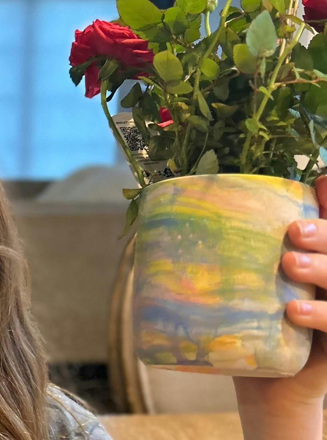 My kids were totally into swirling the colors and watching the marble pattern appear. We might’ve gotten a bit carried away with the swirls but there’s no wrong way to create! We filled out finished planter with flowers and it came out adorable!